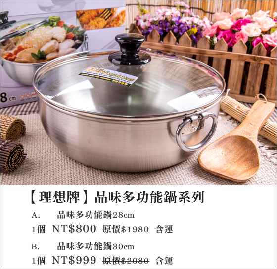 包含更進一步圖文資訊的介紹!點擊圖片或文字可以進到更詳細購物推薦網站~CLARE一向是個理性的消費者,能讓他讚賞的商品不多了!我有去遍尋各大購物網站momo購物、yahoo奇摩購物、博客來、PChome線上購物、ibon mart搜尋優惠價格!售價隨時會調整;特價有時效性,有需要的人動作要快!理想牌-品味多功能鍋系列數量有限,售完為止!限量是殘酷的,不要猶豫入手要快~ |