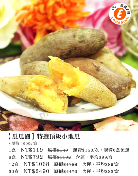 | 瓜瓜園-特選頂級小地瓜-酷似養生聖品人蔘的特級小地瓜!低卡路里天然美食,台南新化嚴選蕃薯,香Q鬆軟可口,冰熱兩吃各具風味!平均每盒最低只要83元起即可購得【瓜瓜園】特選頂級小地瓜1盒/8盒/12盒/3 售價:83 我要購買 |
