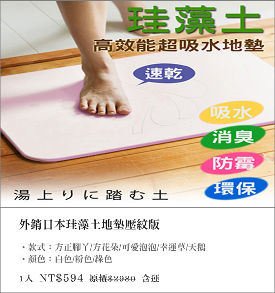 | 外銷日本珪藻土地墊壓紋版-無法忍受到處踩出水印!地墊全新升級珪藻土材質,每滴水不漏接,一腳踩過乾淨清爽,清理簡單,家家戶戶必備只要594元(含運)即可購得原價2980元外銷日本珪藻土地墊壓紋版任選1入 售價:594 我要購買 |